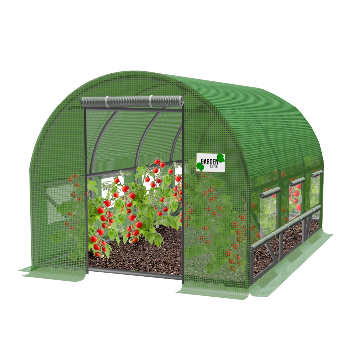 Šest bočnih oken z mrežo proti komarjem ter možnost podviti folijo pri dnu zagotavljata odličen pretok zraka, zmanjšujeta vlago in ščitita pred pregrevanjem ter škodljivci.