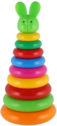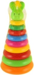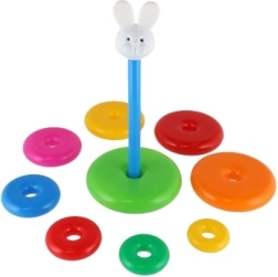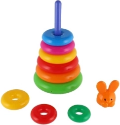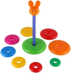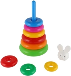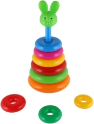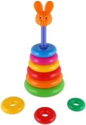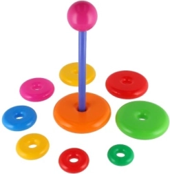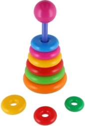 Ta zlagalna piramida z barvnimi obročki je idealna prva gradbena igrača. Otroci natikajo obročke na palico in jih zlagajo od največjega do najmanjšega, s čimer naravno urijo fino motoriko, potrpežljivost in logično razmišljanje. Osnovo predstavlja trdno plastično stojalo s palico in odstranljivim zgornjim delom (odvisno od različice).
