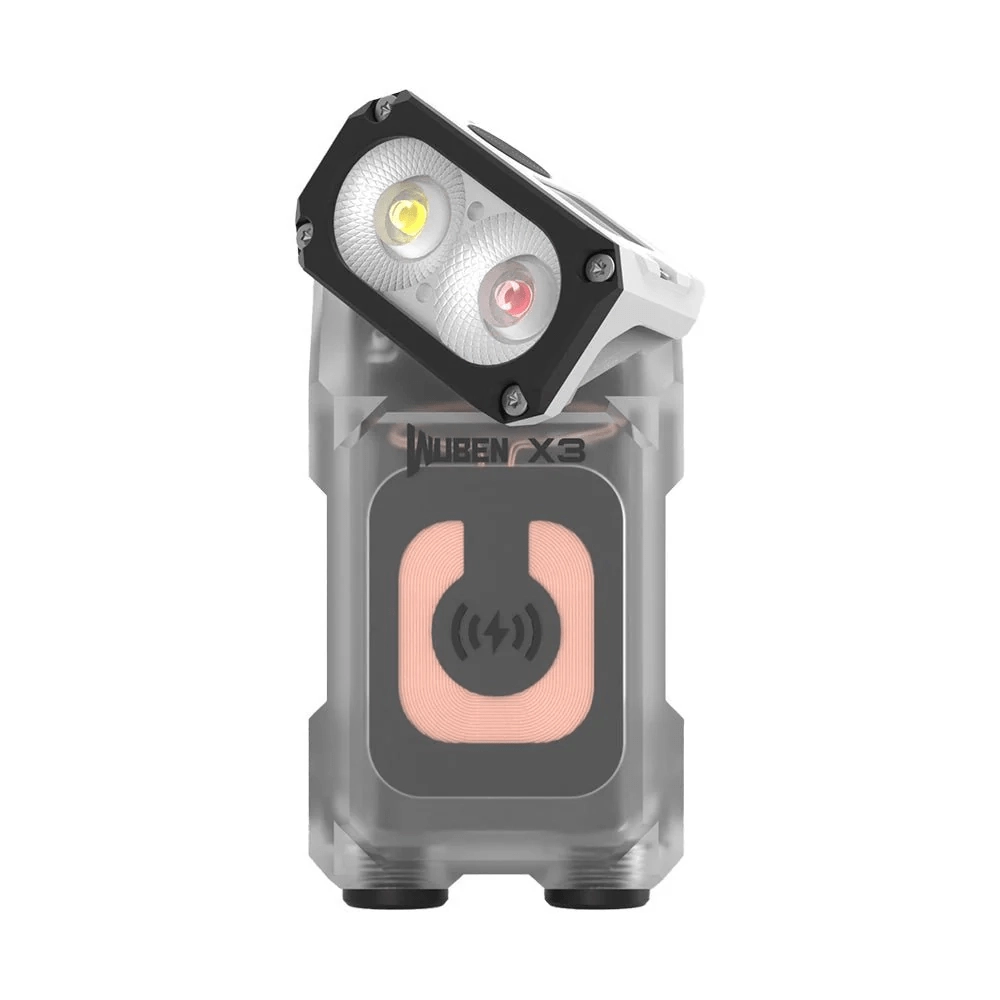 WUBEN X3 WHITE je pametna žepna svetilka za vsakodnevno nošenje, ki združuje močno belo svetlobo iz Samsung LH351D (do 700 lm) s praktično rdečo svetlobo iz LED Luminus SST10 (do 80 lm). 180° vrtljiva glava vam omogoča usmerjanje žarka natančno tja, kjer ga potrebujete, vgrajen LCD-zaslon pa jasno prikaže stanje baterije in izbrani način.