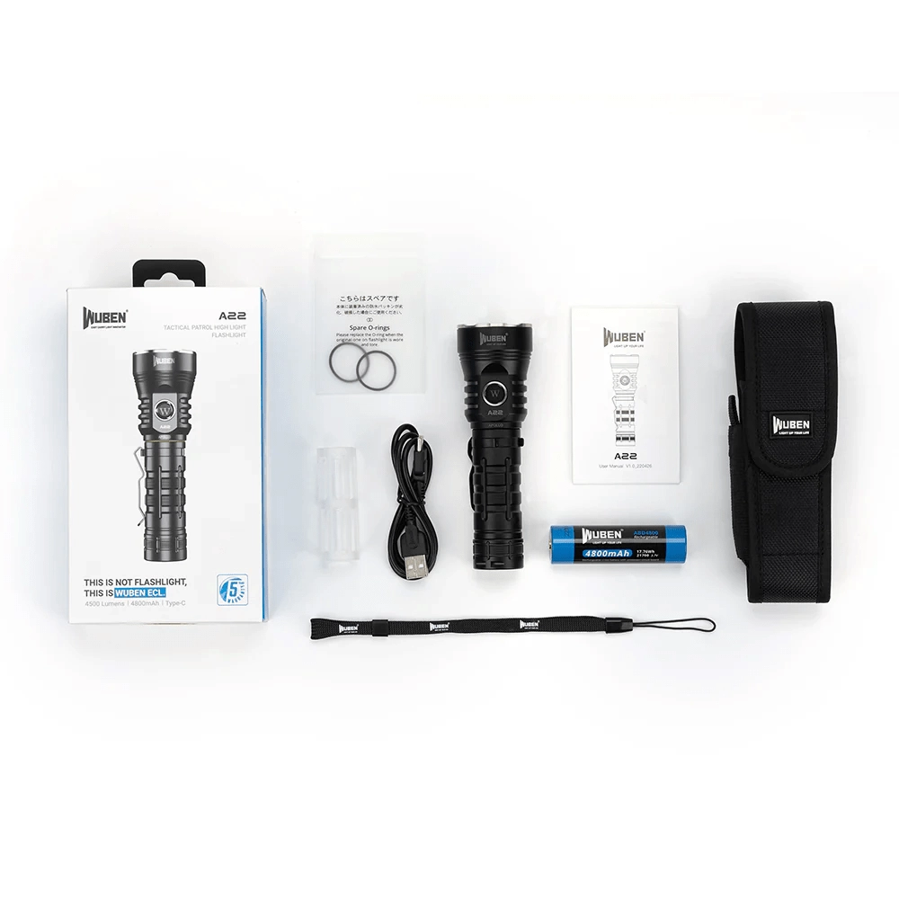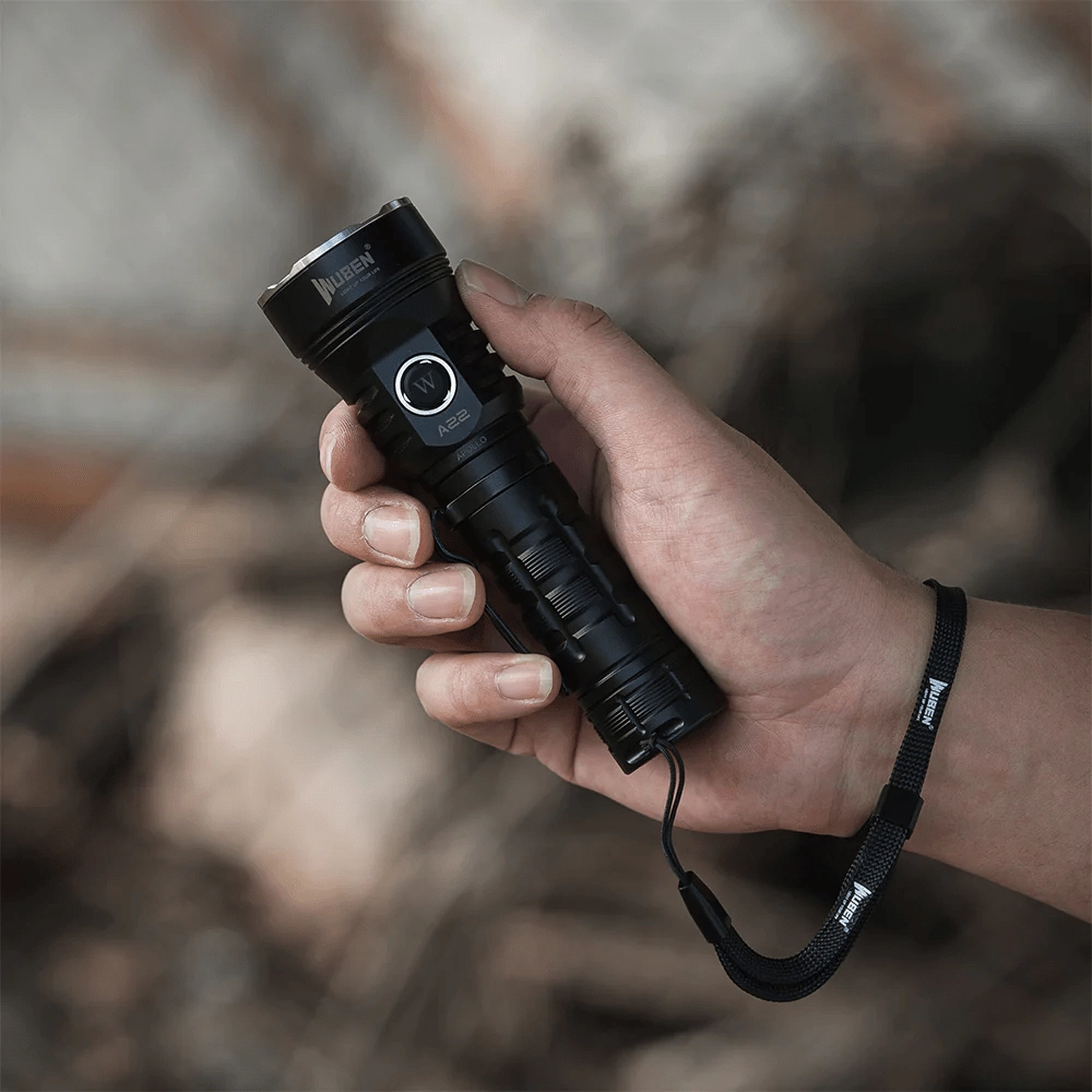Wuben A22 je zanesljiva svetilka za kampiranje, pohodništvo, delavnico in dom. Zahvaljujoč LED CREE XHP70.2 zagotavlja izjemno svetel snop do 4.500 lumnov z dosegom 290 metrov. Ergonomično kovinsko ohišje s sponko, globokim reflektorjem in stranskim gumbom omogoča udobno in varno uporabo tudi v zahtevnih razmerah.