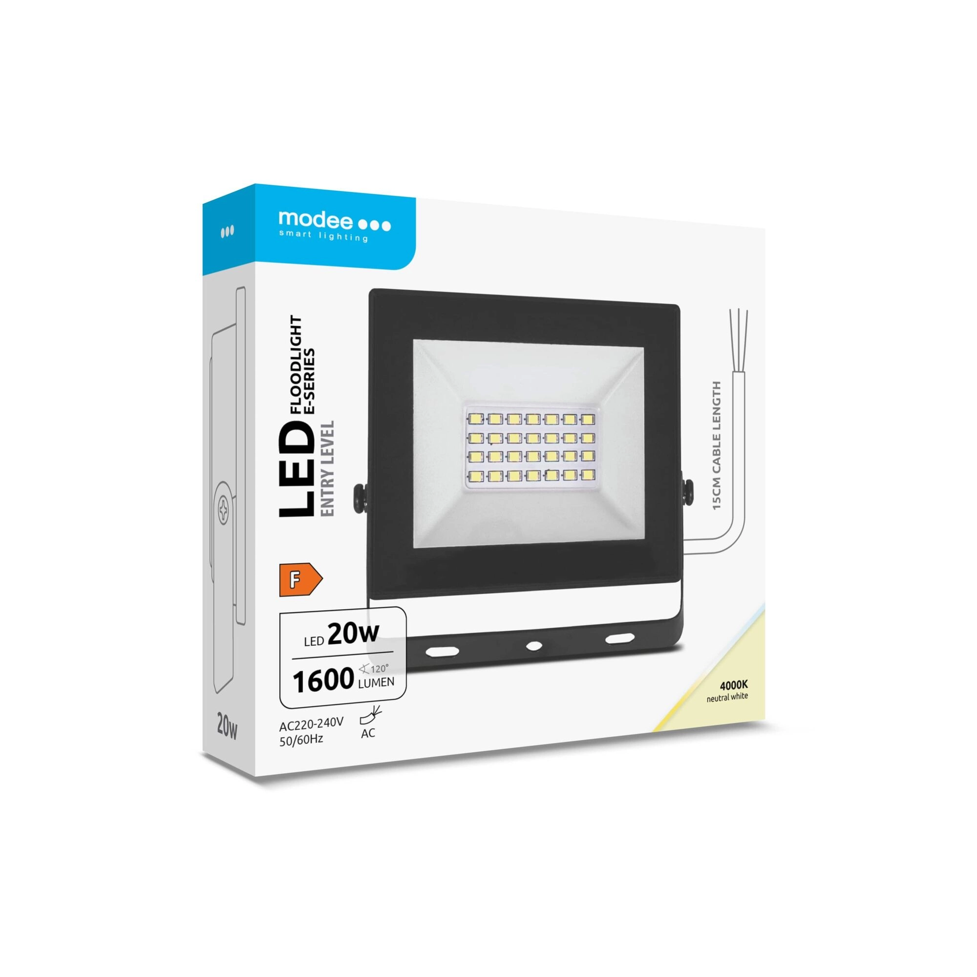 Kompakten LED reflektor MODEE E‑series Slim ponuja svetlih 1600 lm pri porabi 20 W, prijetno nevtralno belo 4000 K in širok kot svetilnosti 120°. Zahvaljujoč zaščiti IP65 je odporen proti prahu in curku vode, zato je primeren za osvetlitev dovozov, vrtov, teras ali dvorišč. Praktičen 15‑cm namestitveni kabel olajša montažo.