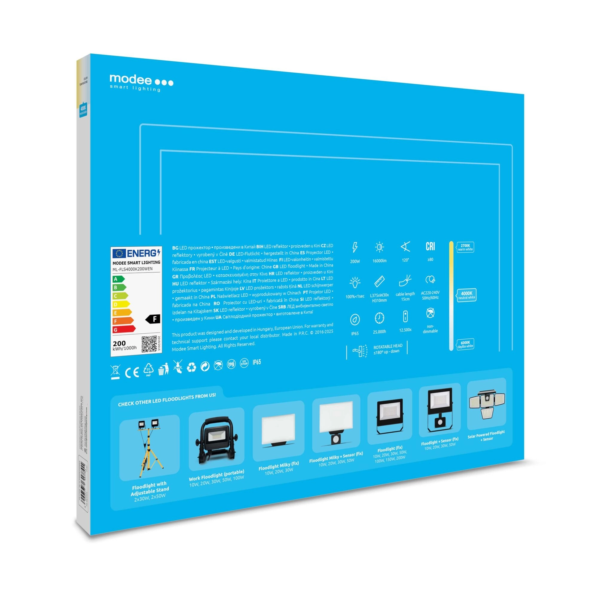 Reflektor MODEE E‑series Slim združuje nizko porabo z visoko svetlobno zmogljivostjo. Zahvaljujoč svetlobnemu toku 16 000 lm in kotu sevanja 120° zanesljivo osvetli garažne dovoze, terase, vrtove, skladišča in proizvodne hale. Barvna temperatura 4000 K (nevtralno bela) nudi naravno in neutrudljivo svetlobo za vsakodnevno uporabo.