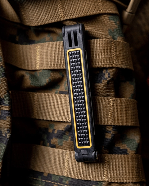 Kompakten A‑okvir se zloži na žepno velikost, kovinski spon pa omogoča varno pripenjanje na nahrbtnik, MOLLE pritrdišče ali žep – vedno pri roki.