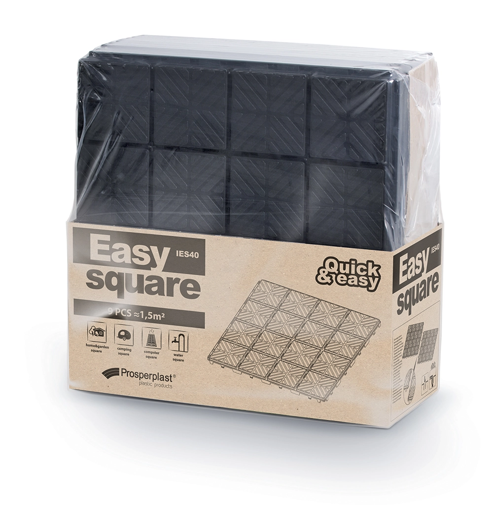 Modularne plošče EASY SQUARE 40 × 40 cm so univerzalna rešitev za teraso, balkon, okolico bazena in garažo. Zahvaljujoč zložljivemu (klik) sistemu se hitro polagajo in razstavljajo, so protizdrsne, odporne na zmrzal in odporne proti vlagi. Pakiranje 9 kosov pokrije 1,5 m², črna barva pa se zlahka uskladi s katerim koli slogom.