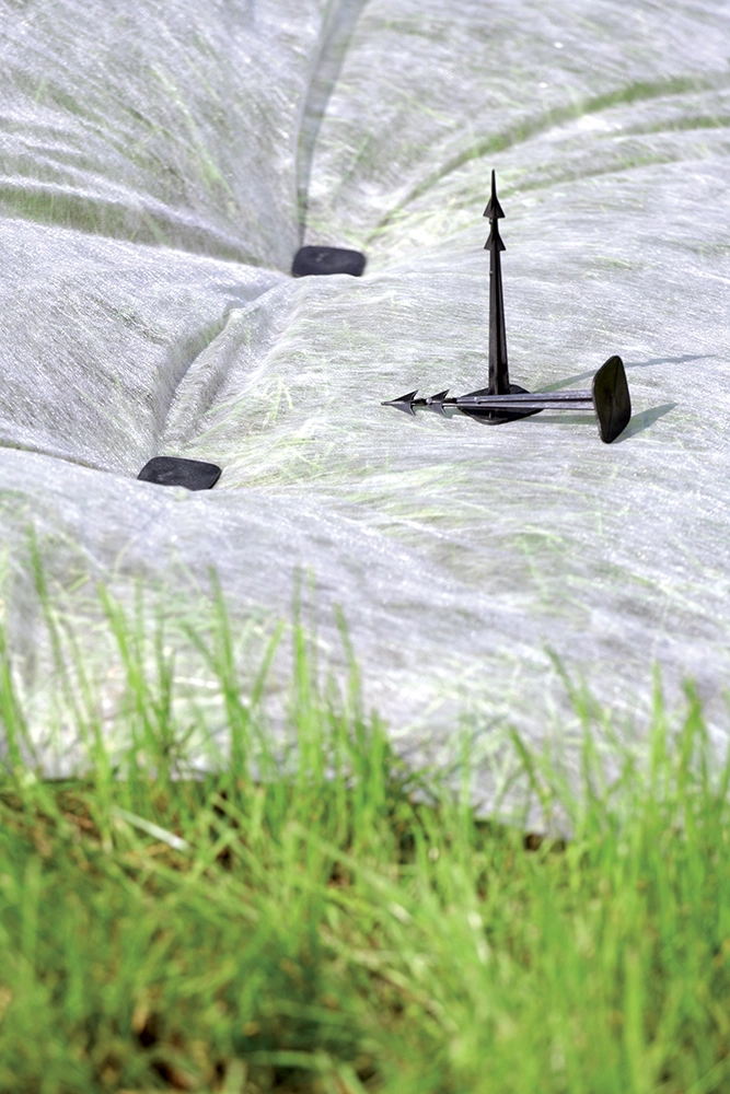 Ploska, široka glava enakomerno pritisne agrotekstil ali folijo k podlagi, s čimer zmanjšuje dvigovanje, podpihovanje in premikanje materiala.