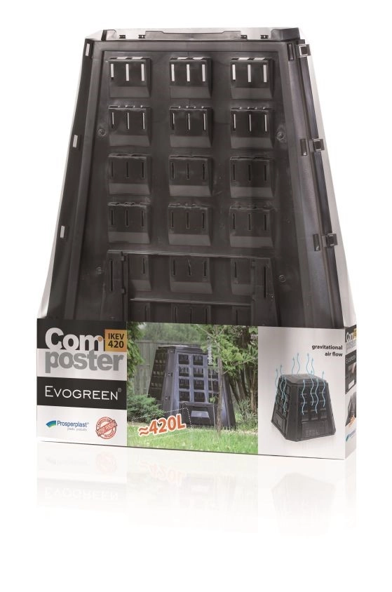 Kompostnik Evogreen 420 l je idealna izbira za vsak vrt. Velika prostornina sprejme travo, listje in kuhinjske ostanke ter jih pretvori v s hranili bogat kompost. Odporna zasnova in premišljene zračne odprtine zagotavljajo optimalno kroženje zraka, ki podpira učinkovito razgradnjo materiala.