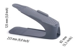 Zahvaljujoč trpežni plastiki je organizator čvrst, lahek in enostaven za čiščenje. Protizdrsni elementi povečujejo stabilnost pri shranjevanju obutve, kot so sandali, superge, mokasini ali natikači. Prilagodljiva oblika brez težav sprejme čevlje z največjo višino 12 cm in je idealna za velikosti 30–38, kar pokriva otroško in manjšo damsko obutev.