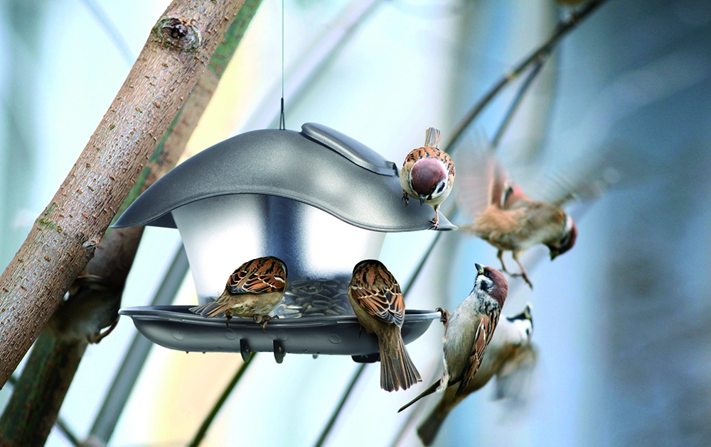 Stilska ptičja krmilnica z modernim dizajnom in vzdržljivo konstrukcijo iz plastike in kovine. Prozorna posoda omogoča enostaven nadzor nad količino krmil, poševna streha ščiti pred dežjem in snegom, prilagodljiva namestitev pa omogoča obešanje, pritrjevanje na ograjo ali namestitev na kol.