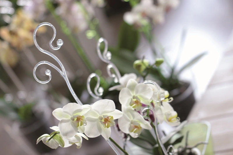 Nežne krivine in stranske zanke elegantno vodijo stebla ter orhidejam dodajo slog brez kompromisov pri stabilnosti.