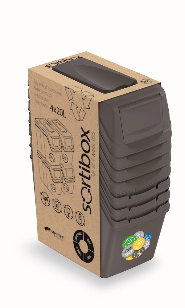 Praktičen set štirih zabojnikov za ločevanje odpadkov SORTIBOX s prostornino 4×20 litrov je idealen za gospodinjstva in pisarne. Zaradi modularne zasnove jih je mogoče enostavno kombinirati, zlagati in prilagoditi prostoru. Elegantna barva sivi kamen se odlično poda k modernemu interierju in olajša pregledno ločevanje odpadkov.