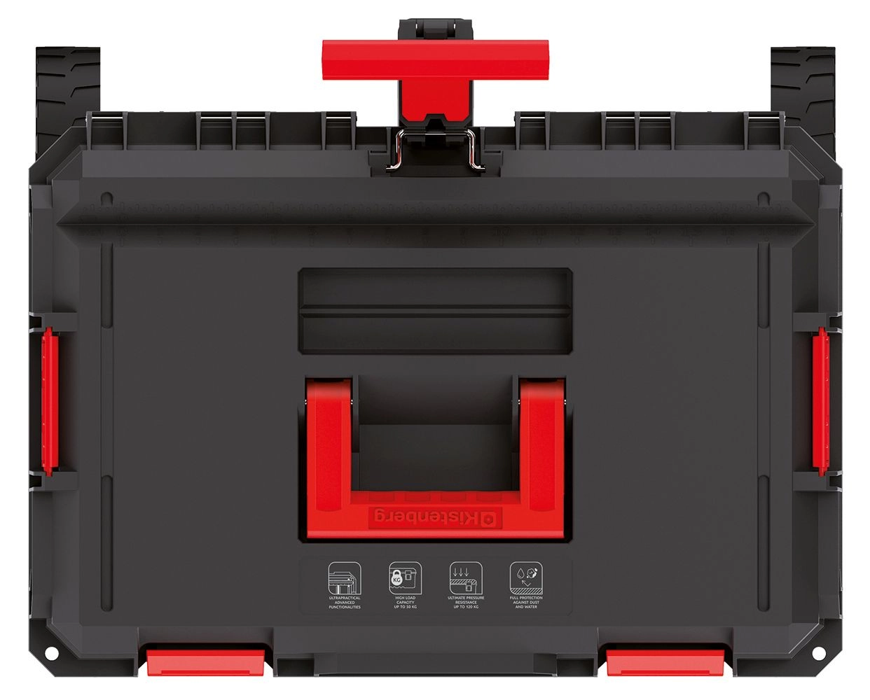 Velika terenska kolesa in teleskopska ročica zagotavljajo udobno premikanje tudi po neravni podlagi. Integrirane aluminijaste vodilnice v pokrovu izbranih modulov omogočajo, da kovček spremenite v stabilno delovno mizo. Neposredna obremenitev do 120 kg omogoča uporabo kot pomožnega stopnička, medtem ko notranja organizacija poskrbi, da je orodje vedno pri roki.