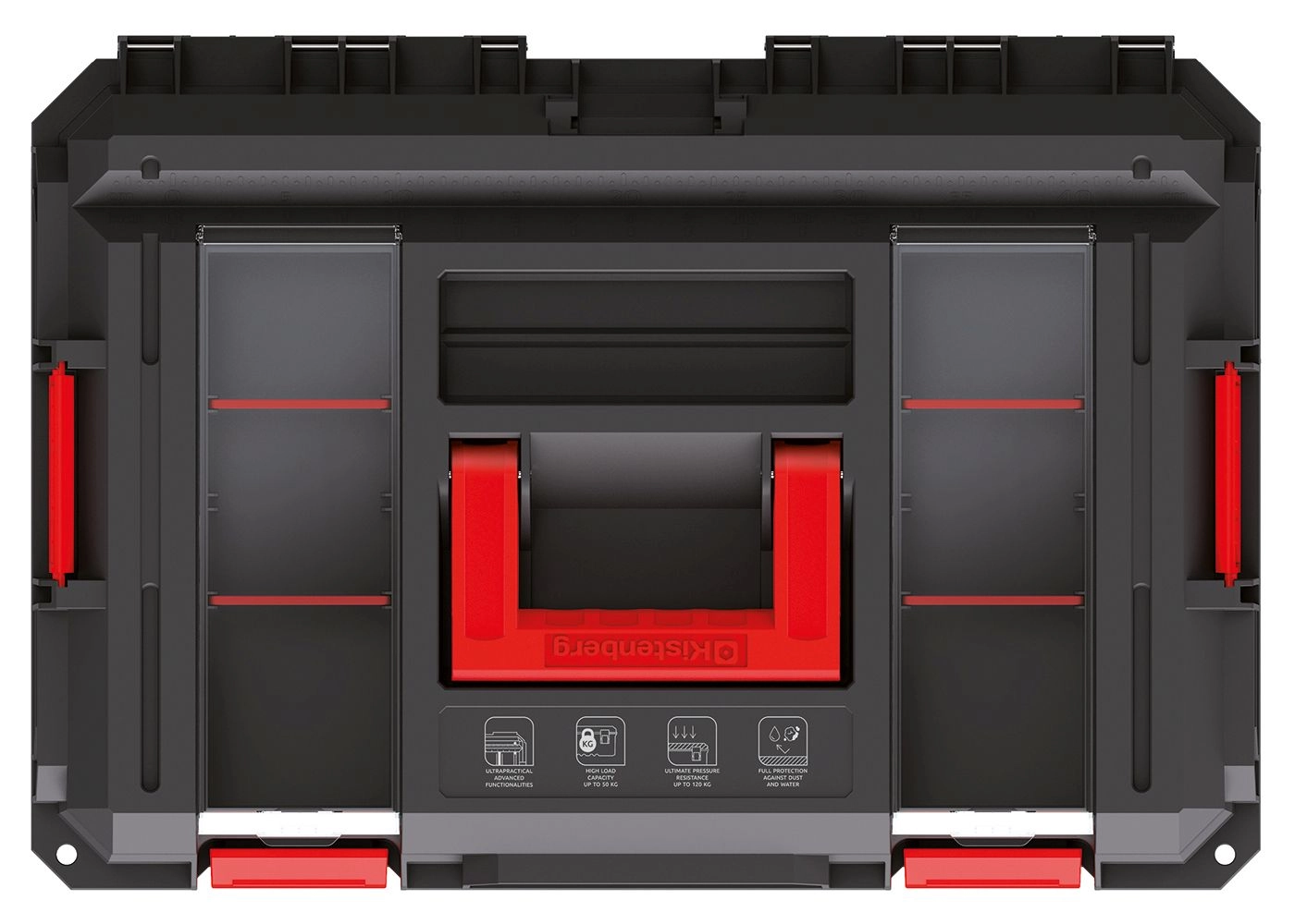 Rebraste stene, ojačani tečaji in masivne zaponke zagotavljajo dolgo življenjsko dobo. Kapaciteta kovčka je do 50 kg, neposredna obremenitev modulov do 120 kg.