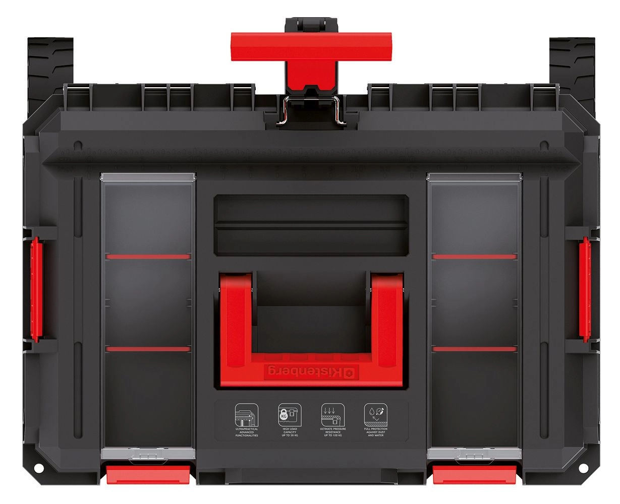Trpežna delavniška škatla s kolesi je zasnovana za vsakodnevno delo v zahtevnih pogojih. Rebrasta konstrukcija in kakovostna plastika kljubujeta udarcem, medtem ko vgrajeno tesnilo ščiti vsebino pred prahom in škropečo vodo. Zaradi velike prostornine in pametnega pokrova s predalčki imate drobne dele vedno pri roki.