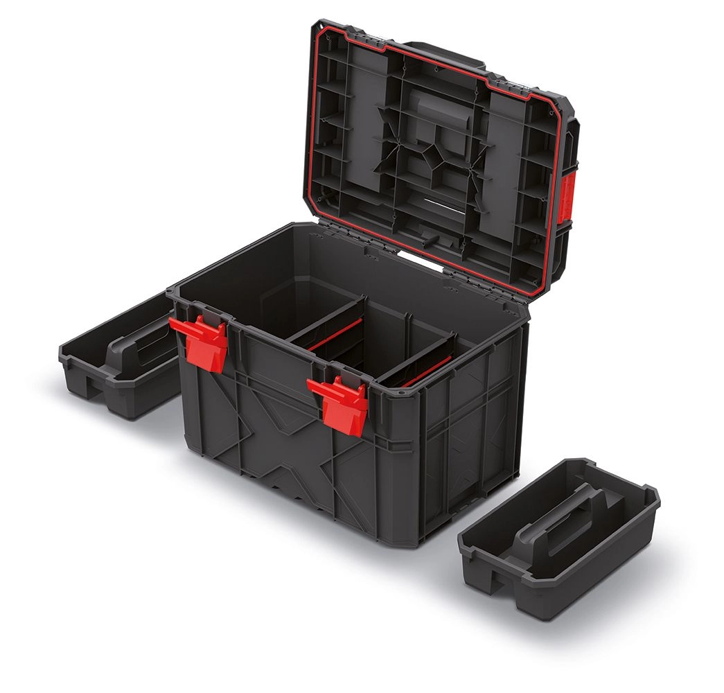 Kovček za orodje X-BLOCK TECH je zasnovan za strokovnjake, ki potrebujejo zanesljivo in modularno rešitev za delavnico in gradbišče. Robusten rebrast dizajn, tesnjenje proti prahu in vodi ter zmogljiva zapirala ohranjajo vaše orodje varno tudi v zahtevnem obratu. Aluminijaste tirnice v pokrovu spremenijo kovček v kompaktno delovno površino.