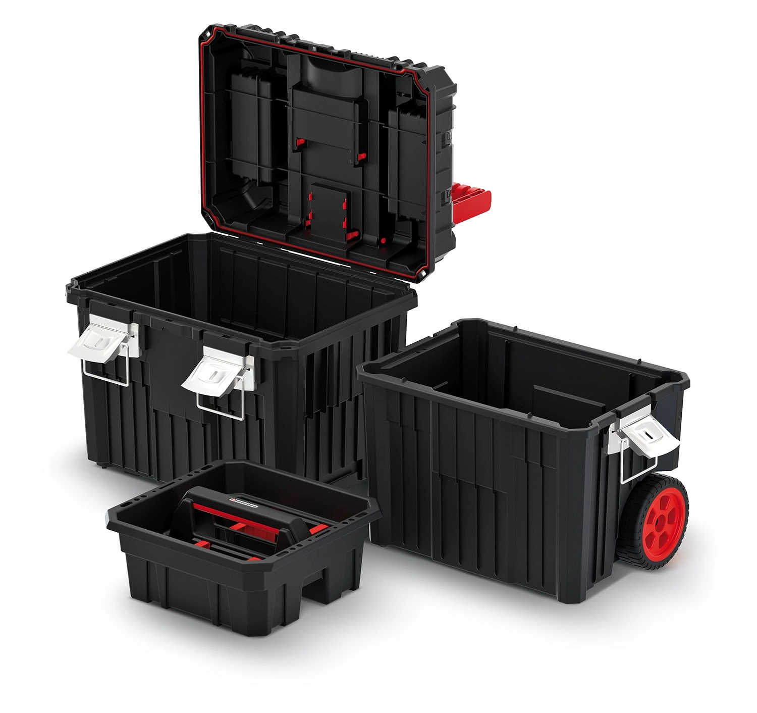 V notranjosti boste našli odstranljiv koš za drobno orodje in dodatke ter transparentne organizatorje s polikarbonatnimi pokrovi za hitro orientacijo brez odpiranja. Zahvaljujoč nosilnosti do 25 kg in prostornini 71 l sprejme tako ročno orodje kot tudi večjo opremo.