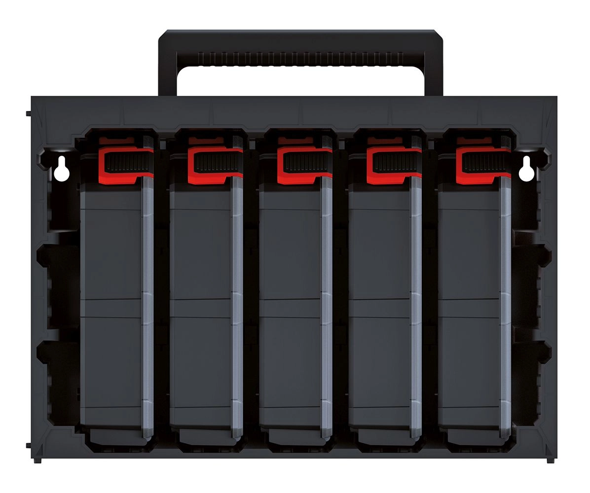 Praktična omarica s 5 odstranljivimi organizatorji Kistenberg TAGER CASE prinaša red v delavnico, garažo in gospodinjstvo. Zahvaljujoč pregradam in prozornim pokrovom zlahka razvrstite vijake, matice ali žeblje in hitro najdete, kar potrebujete. Odporna konstrukcija iz polimerov, ergonomski ročaj, možnost obešanja na steno ter zložljiv (stohljiv) dizajn prihrani prostor in poveča preglednost.