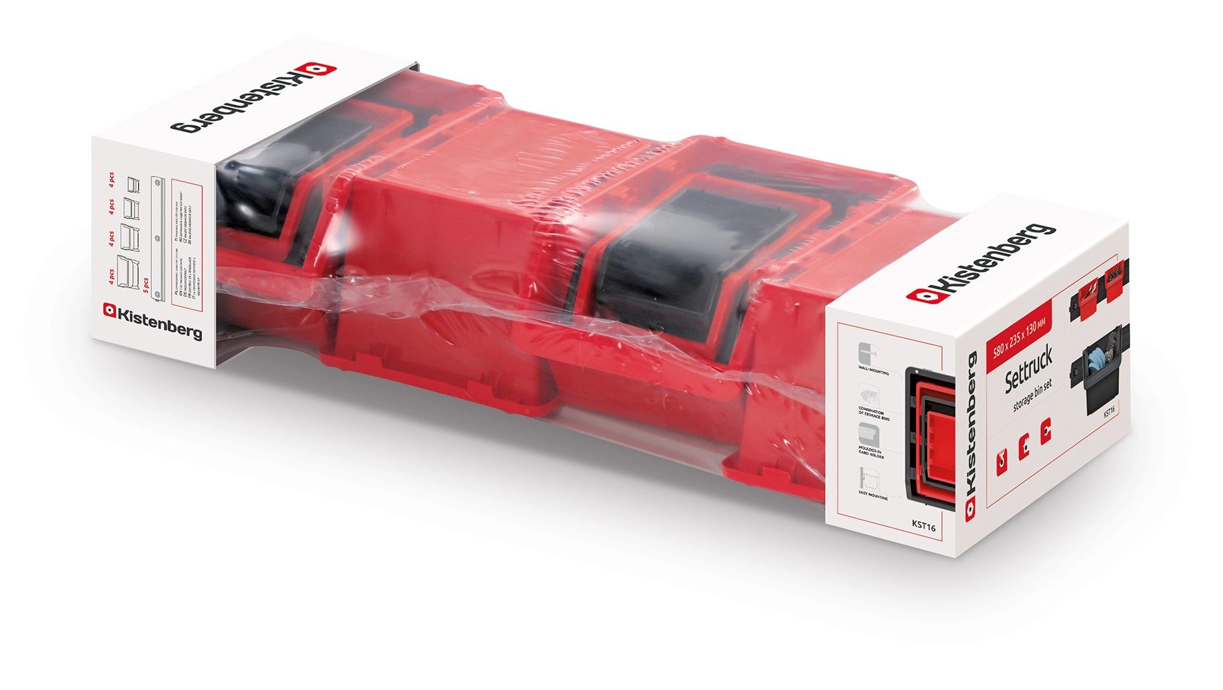 Set stenskih zabojev SETTRUCK je idealna izbira za vsakogar, ki želi ohraniti red in imeti drobne dele vedno pri roki. Zahvaljujoč 5 stenskim letvam lahko zaboje preprosto obesite točno tja, kjer jih potrebujete. Modularni sistem omogoča spreminjanje razporeditve zabojev glede na trenutne naloge in velikost materiala.