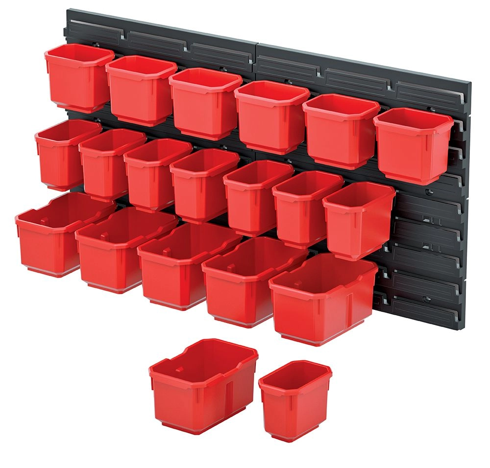 Praktičen viseči panel s skupno 20 škatlami za pregledno shranjevanje vijakov, žebljev in drobnega orodja. Idealen za delavnice, garaže in tehnične prostore. Prihrani prostor, izboljša organizacijo in omogoča hiter dostop do pogosto uporabljenih delov.