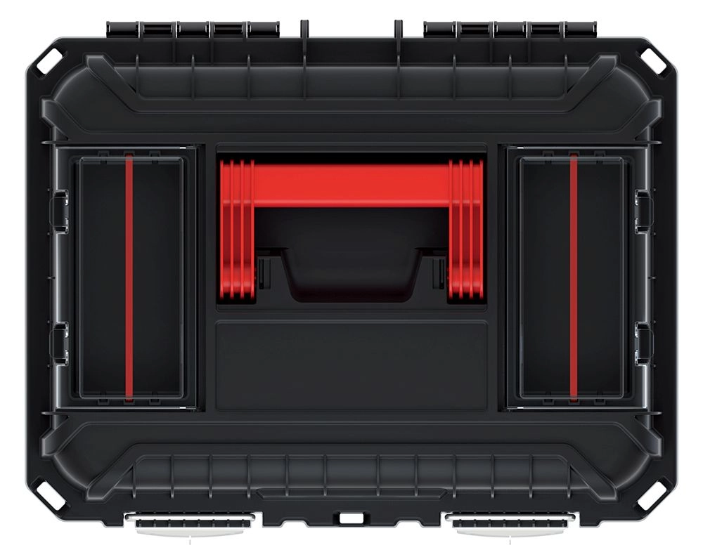Z močnim plastičnim ročajem se kovček udobno prenaša, odstranljiv vložek pa prihrani čas pri delu – najpomembnejše imate vedno pri roki. Praktični zunanji predalčki dodajajo dodaten prostor za vijake, bite in druge majhne dele.