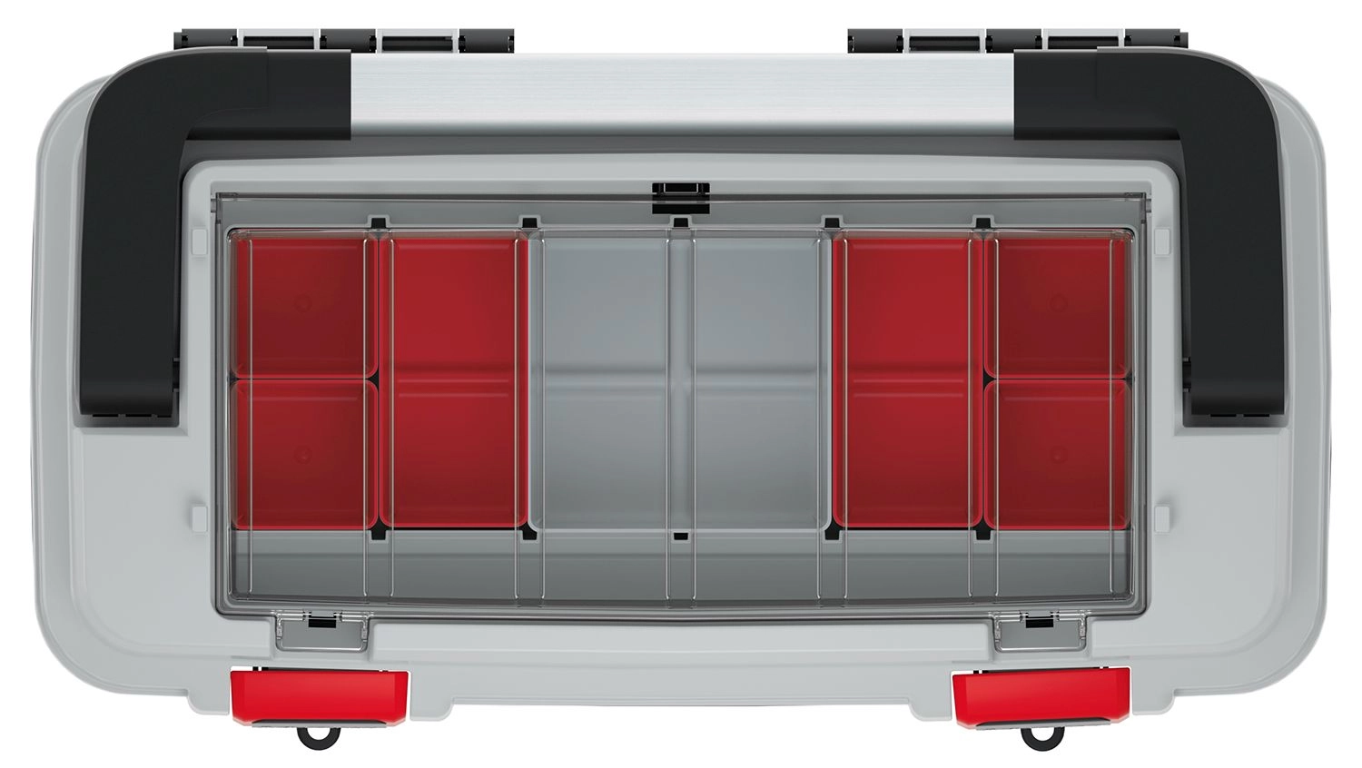 Pokrov s prozornim panelom omogoča hitro orientacijo brez odpiranja, kar prihrani čas in živce. Odporno plastično ohišje z ojačitvami je pripravljeno na vsakodnevno uporabo v delavnici, garaži in na gradbišču. Idealna izbira za obrtnike, mojstre in servisne tehnike, ki zahtevajo organizirano shranjevanje orodja in dodatkov.