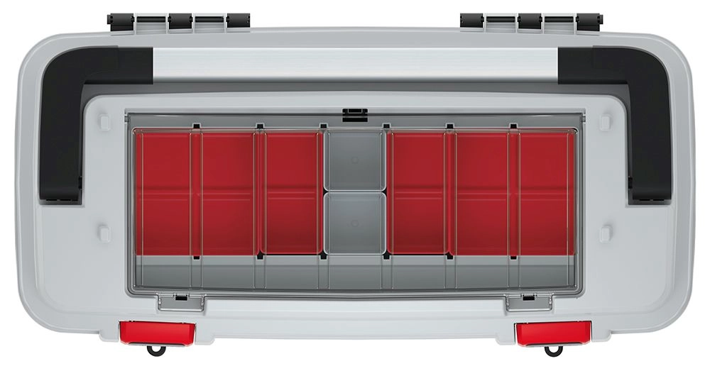 Na pokrovu se nahaja zaprt organizator s škatlicami za vijake, bite in drobne dele, ki prihrani čas pri delu. V notranjosti je odstranljiv vložek za hiter dostop do pogosto uporabljenih orodij. Mere 586 × 296 × 305 mm nudijo dovolj prostora, hkrati pa je kovček še vedno enostavno prenosljiv.