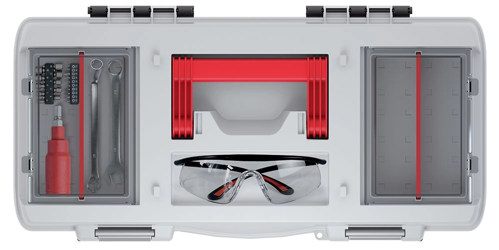 Z odstranljivim vložkom zlahka prilagodite notranjo razporeditev svojim potrebam. Trpežna zasnova in praktične mere 548 × 274 × 286 mm omogočajo udoben prenos in shranjevanje orodja ter dodatkov.
