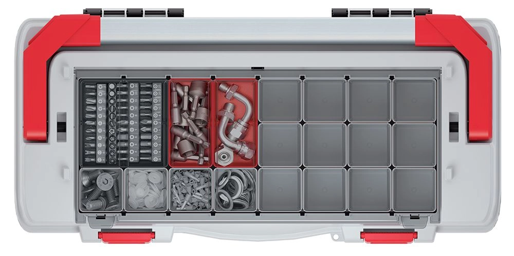 Imejte svoje orodje vedno pri roki in popolno urejeno. Ta vzdržljiva škatla za orodje EVO združuje premišljeno notranjo organizacijo s praktičnimi podrobnostmi za vsakodnevno delo v delavnici, na gradbišču ali doma. Zahvaljujoč kovinskemu ročaju je prenašanje udobno, odstranljiv vložek pa omogoča hiter dostop do najpogosteje uporabljenih pripomočkov.