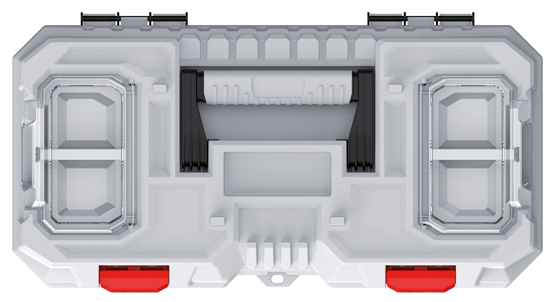 Zahvaljujoč čvrstim plastičnim zapiralom in robustni konstrukciji kovček ostane varno zaprt tudi med prenašanjem. Vgrajeni predelki in pregledna razporeditev pomagajo ohranjati red in skrajšajo čas iskanja pravega orodja. Praktičen zložljiv ročaj omogoča udobno prenašanje.