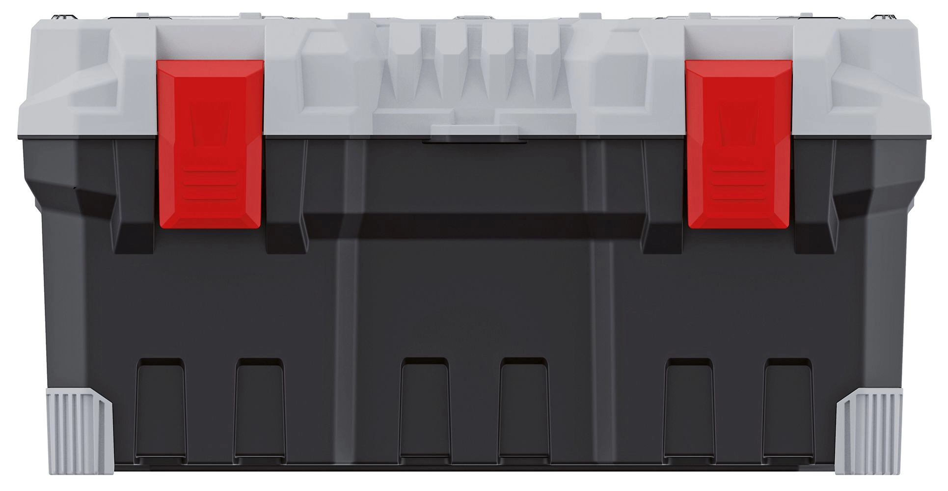Robustna konstrukcija z rdečimi sponkami in ojačanimi vogali ščiti vsebino in prenese zahtevno uporabo na terenu.