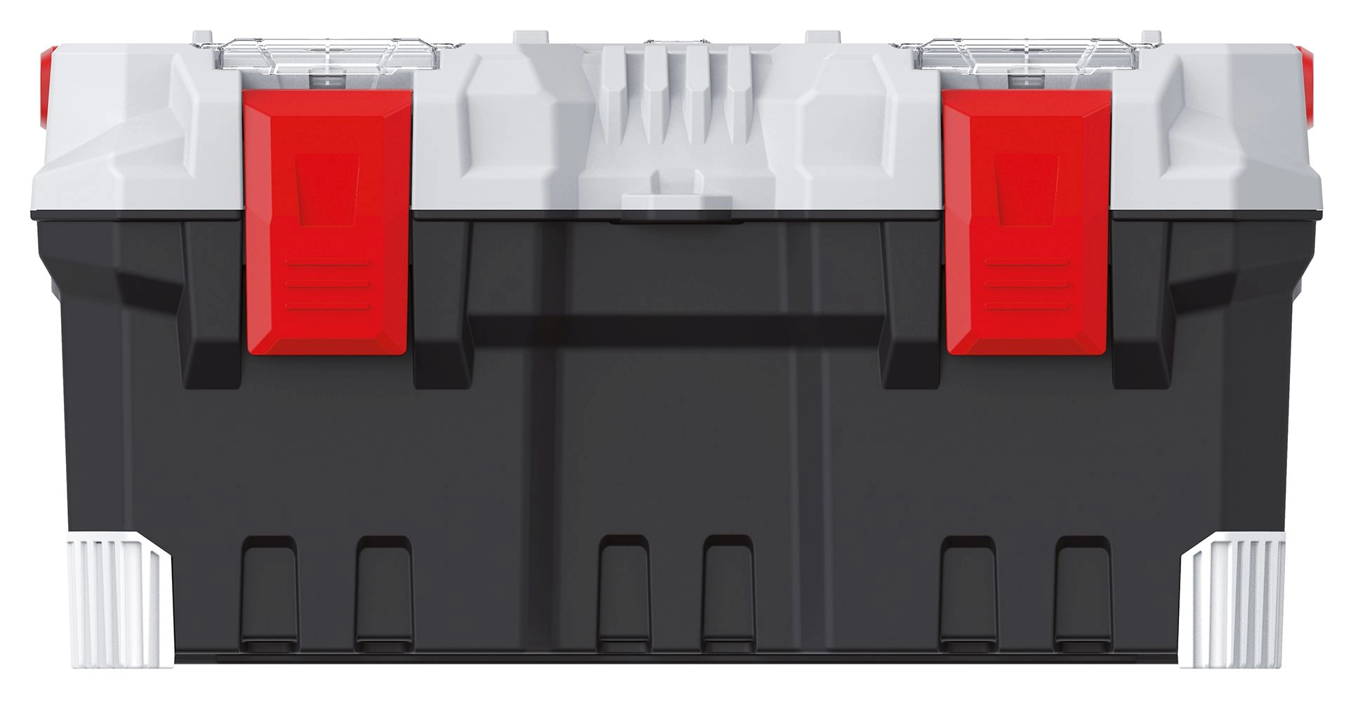 Robustno plastično ohišje z ojačanimi vogali in zanesljive zaponke ščitijo vsebino pri delu in med prevozom.