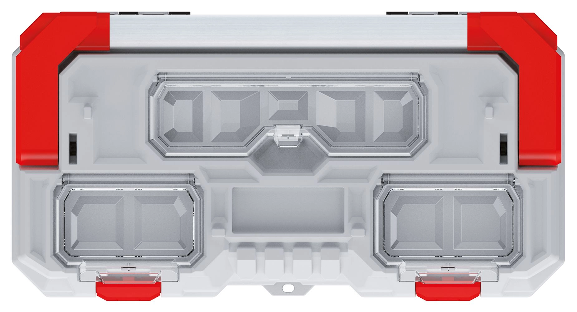 Prozorni predalčki za droben material omogočajo hiter dostop brez odpiranja celotnega kovčka. Idealno za vijake, vložke ali bite.
