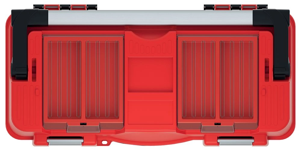 Pametna notranja organizacija prihrani čas in prostor: odstranljivi pladenj je idealen za pogosto uporabljena orodja, medtem ko dva prosojna organizatorja v pokrovu sprejmeta vijake, žeblje in drobne sestavne dele. Kovinski ročaj zagotavlja udoben in zanesljiv oprijem, dvojne aluminijaste zapore pa zanesljivo ščitijo vsebino med transportom.