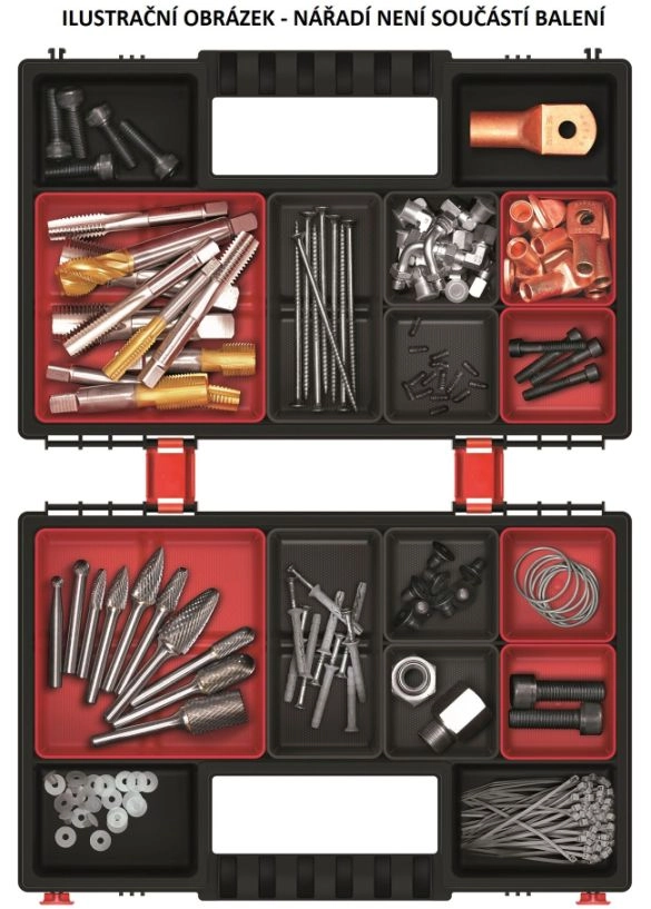 Vsak organizator vsebuje 6 odstranljivih predelkov, ki si jih lahko razporedite glede na trenutne potrebe. Močne zapore in ergonomski ročaj zagotavljajo zanesljiv oprijem in varen transport, medtem ko vzdržljivo ohišje iz polimerne zmesi prenese vsakodnevno uporabo v delavnici in na gradbišču.