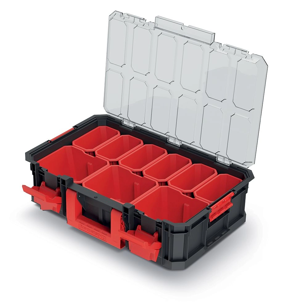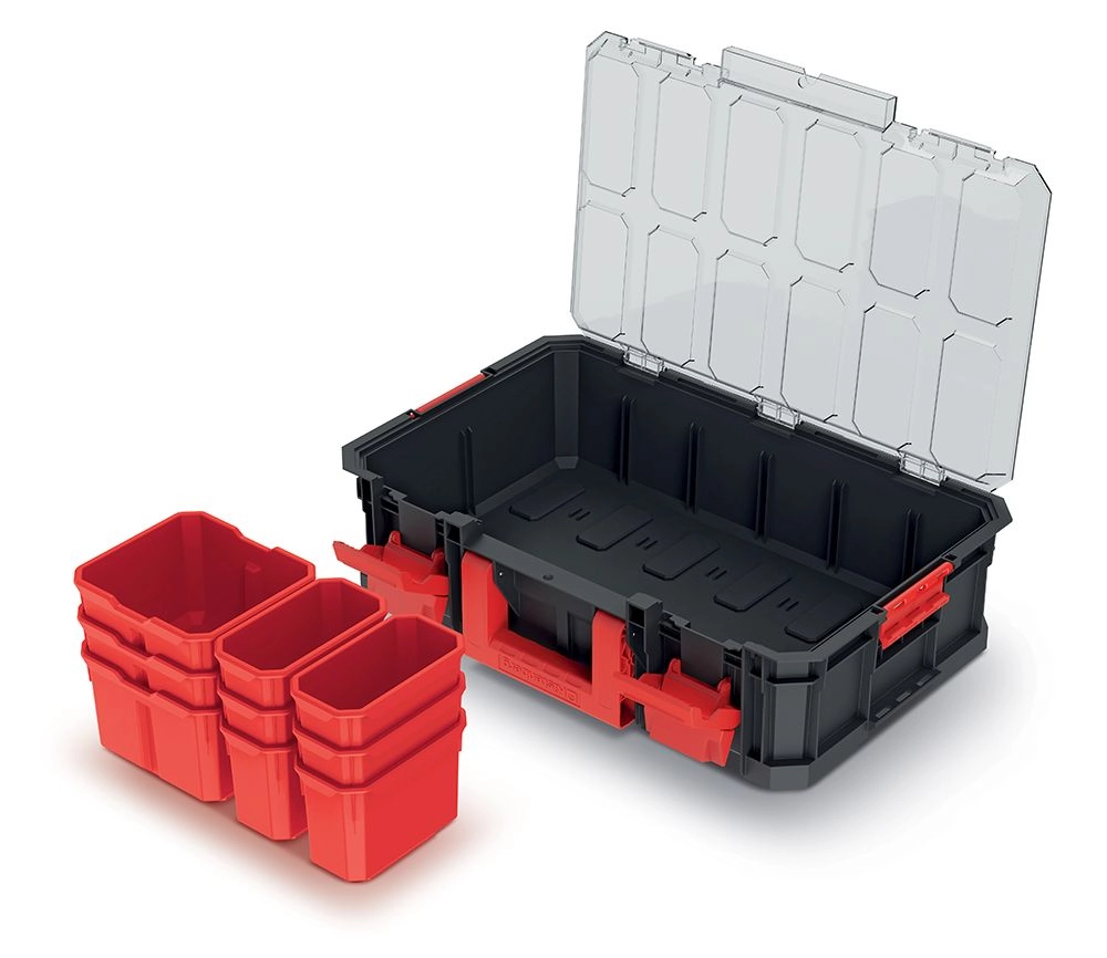 Ohranite svoje orodje, pritrdilni material in dodatke odlično organizirane. Ta modularni transportni zaboj združuje čvrsto konstrukcijo, pregledno organizacijo in enostavno prenosljivost. Prozoren pokrov omogoča takojšen nadzor nad vsebino, odstranljive vložke in pregrade pa prilagodite natančno svojim potrebam.