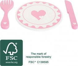 Majhen leseni komplet je okrašen s srčki in je izdelan iz 100% certificiranega FSC® lesa. Otroci ne bodo le navdušeni nad lepim dizajnom, ampak se bodo tudi naučili nekaj o ekologiji in trajnostni rabi virov.