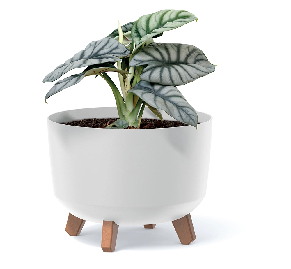 Kratke nogice v lesnem dekorju dvignejo posodo nad podlago, s čimer spodbujajo kroženje zraka in bolj zdrave korenine.