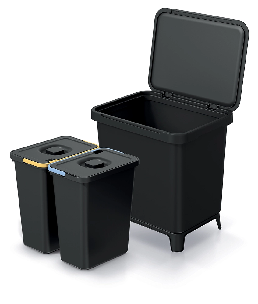 Vzdržljiva reciklirana plastika prenese vsakodnevno uporabo, pokrovi z barvnimi oznakami olajšajo prepoznavo, notranje vložke pa je enostavno odstraniti.