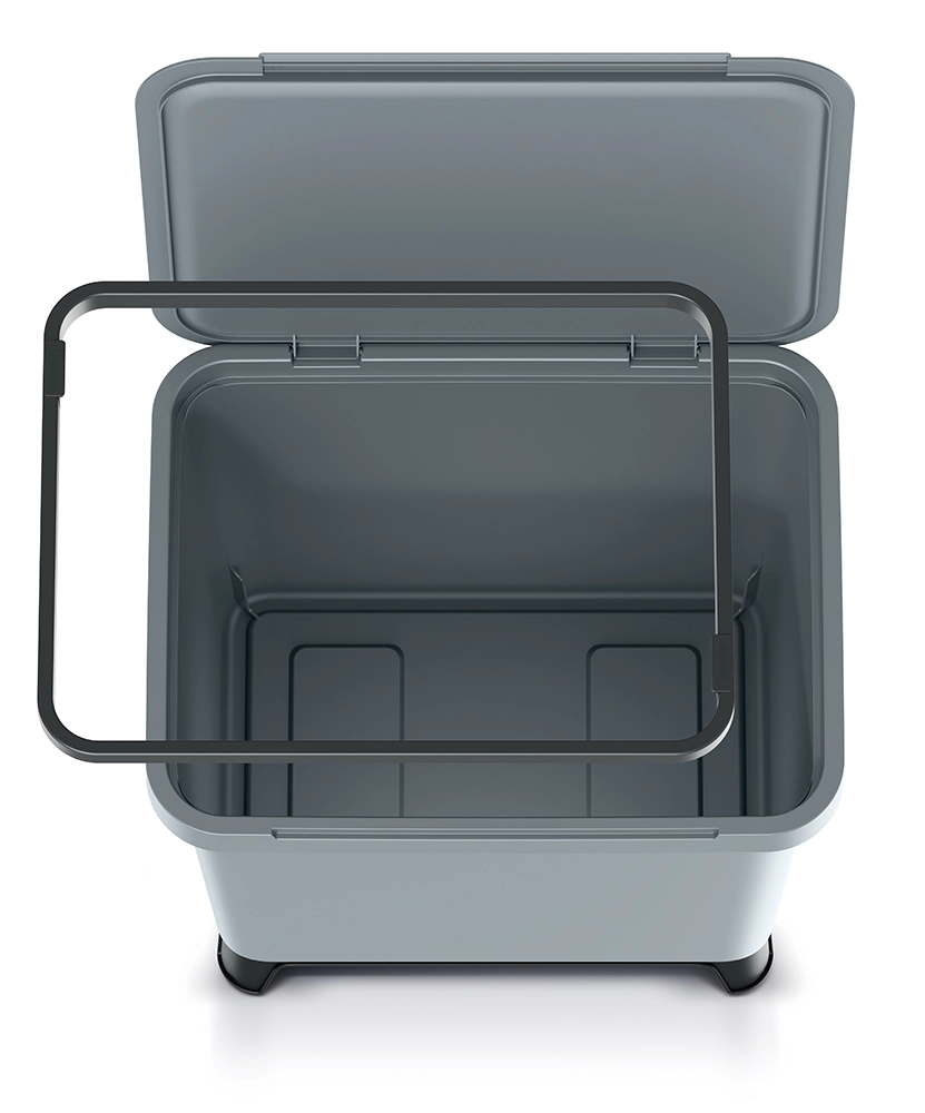 Pokrov omejuje širjenje vonjav in ohranja odpadke diskretno zaprte. Gladka plastična površina je enostavno pralna in odporna proti madežem.