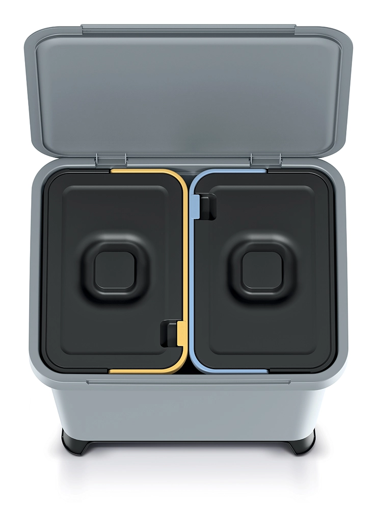 Dvojica odstranljivih vložkov s praktičnimi ročaji omogoča hitro ločevanje plastike, papirja in mešanih odpadkov ter udobno odnašanje.