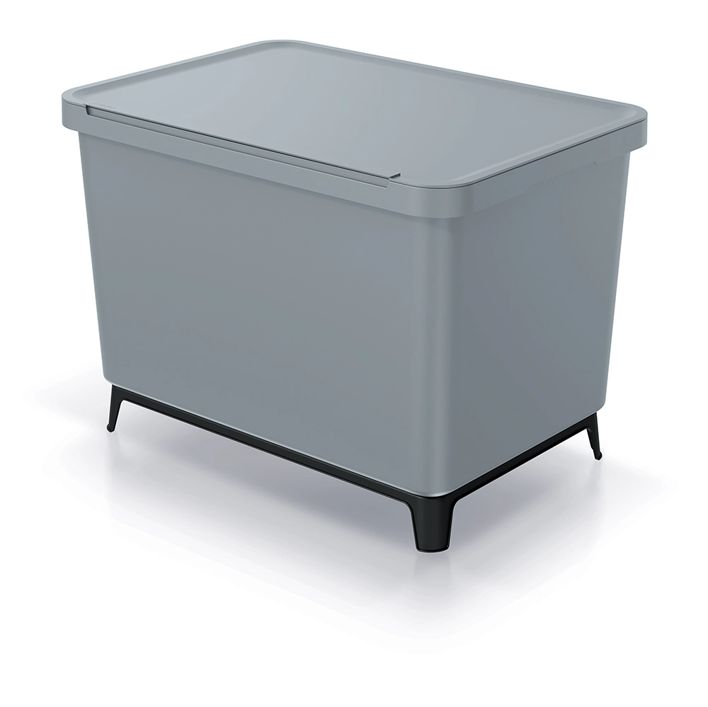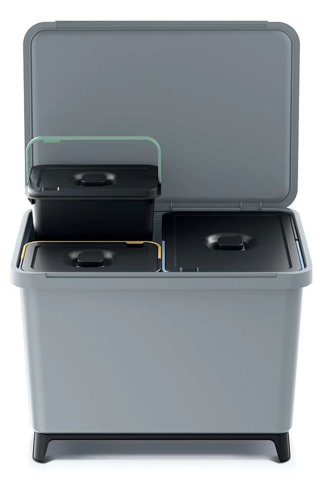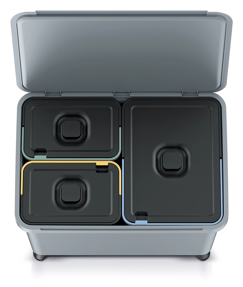 Z širino 56,5 cm, globino 39 cm in višino 41 cm se koš prilega tudi v manjše kuhinje ali pisarne. Barvno označeni pokrovi pospešijo pravilno ločevanje in zmanjšajo napake. Stabilno stojalo drži koš trdno na mestu, za največji prihranek prostora pa je na voljo možnost obešanja na steno.