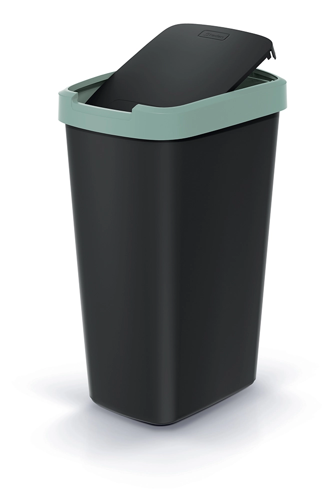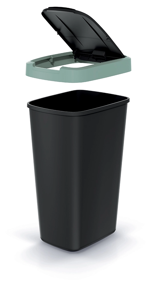 Eleganten in prostorsko varčen koš s prostornino 45 litrov je idealna izbira za kuhinjo, pisarno in manjše prostore. Ohišje iz trpežne plastike v mat črni barvi dopolnjuje diskreten svetlo zeleni rob, ki daje moderen videz in olajša usklajevanje z interierjem.