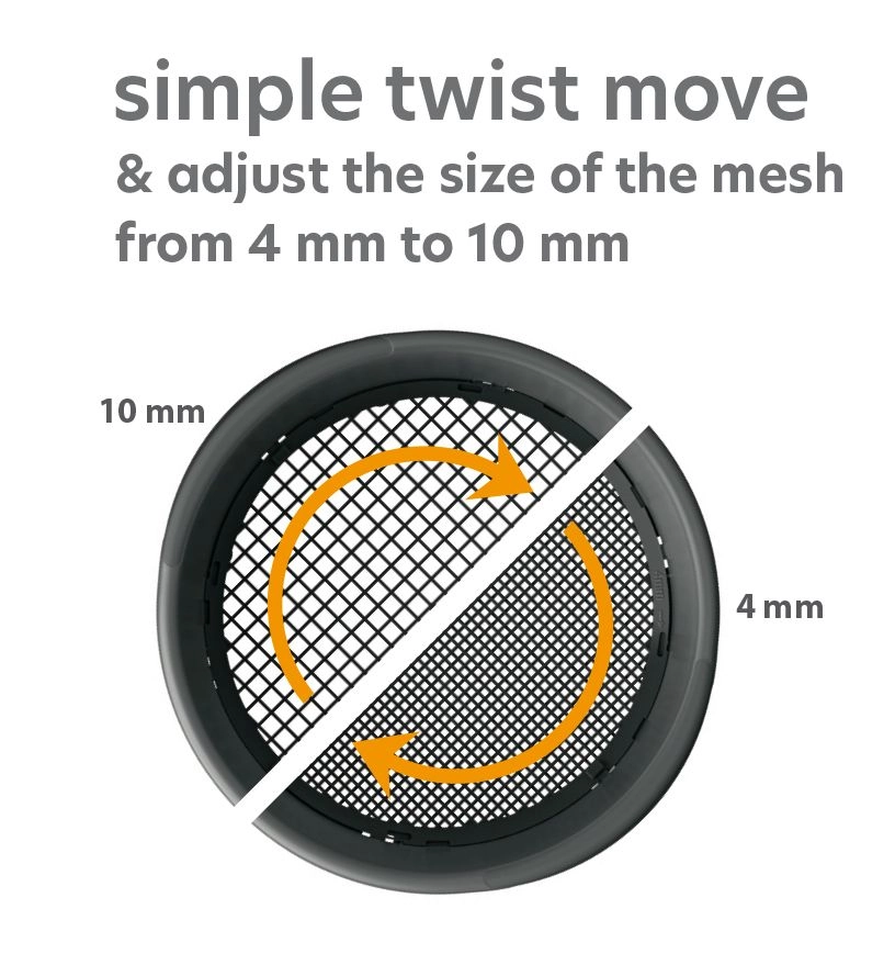 Zahvaljujoč trdni plastiki je sito odporno na vremenske vplive, enostavno za čiščenje in udobno za držanje. Vrtljiv obroč z gladkim delovanjem omogoča hitro spremembo sita brez menjave okvirja – idealno za različna vrtnarska opravila.