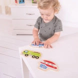 Ta komplet lesenih puzzlov prinaša štiri priljubljena prevozna sredstva, ki jih otroci zlahka sestavijo iz dveh trdnih delov. Preproste oblike, izrazite barve in prijetna lesena izvedba vabijo k ponavljajoči se igri ter naravno podpirajo razvoj govora, prepoznavanje oblik in barv ter osredotočenost.