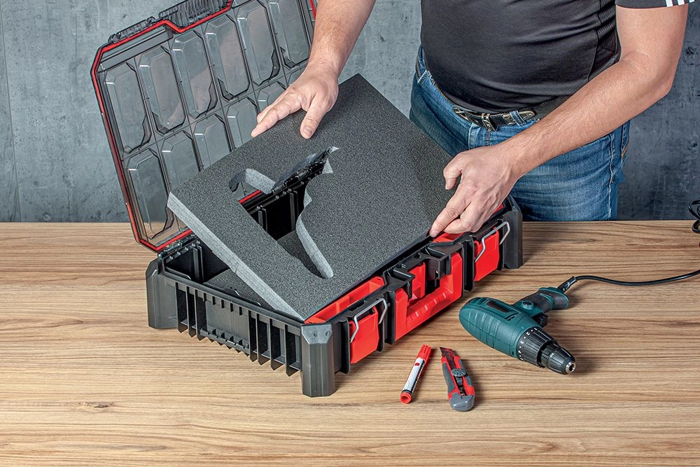 Vložek ohranja orodje pregledno urejeno in zaščiteno pred udarci. Primeren za kovčke in organizatorje z več predelki.