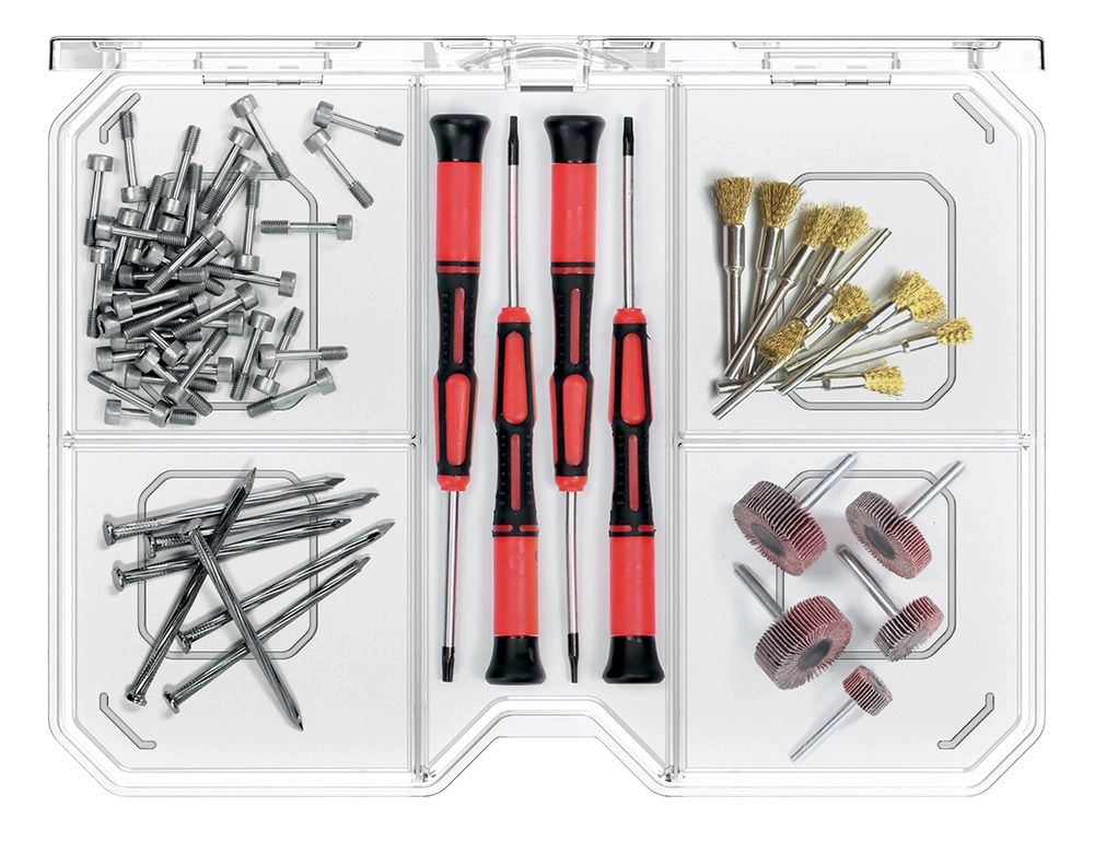 Ohranite red med malenkostmi s kompakt nim organizatorjem, ki zlahka sodi na polico, v predal ali kovček za orodje. Prosojna izvedba vam omogoča, da takoj vidite vsebino, zato prihranite čas pri iskanju pravega kosa.