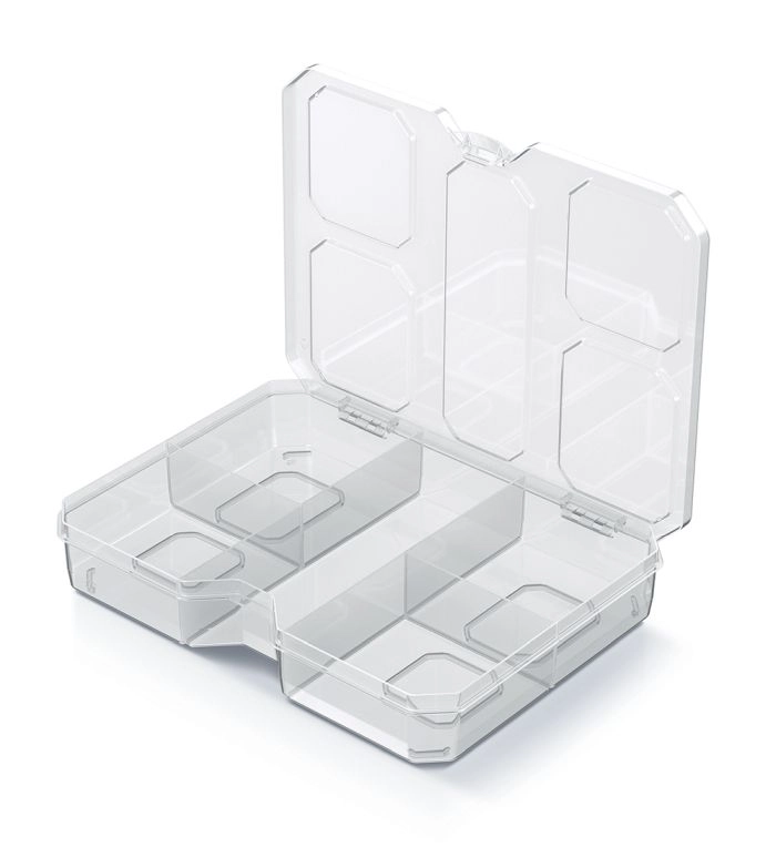 Organizator ponuja 5 trdnih predelkov za logično razvrščanje pritrdilnega materiala in majhnih komponent. Odporna plastika ščiti vsebino pred mehanskimi poškodbami, zložljiv (stapljiv) dizajn pa pomaga učinkovito izkoristiti prostor pri shranjevanju več škatel.