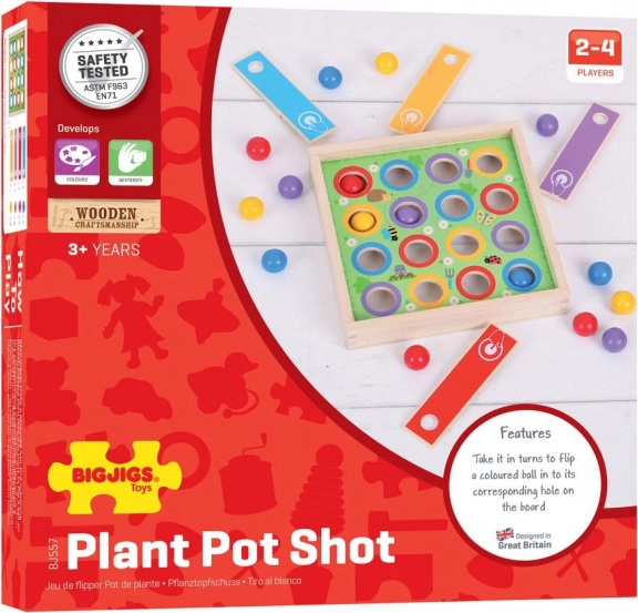 Zabavna družinska igra za otroke od 3 let, ki razvija fino motoriko, pozornost in koordinacijo oko–roka. Cilj je s pomočjo izstreljevalnikov izstreliti barvne kroglice v ustrezne odprtine na plošči. Igra za 2–4 igralce v rdeči, modri, rumeni in vijolični barvi. Izdelano iz odgovorno pridobljenega lesa in v skladu z evropskimi varnostnimi standardi.