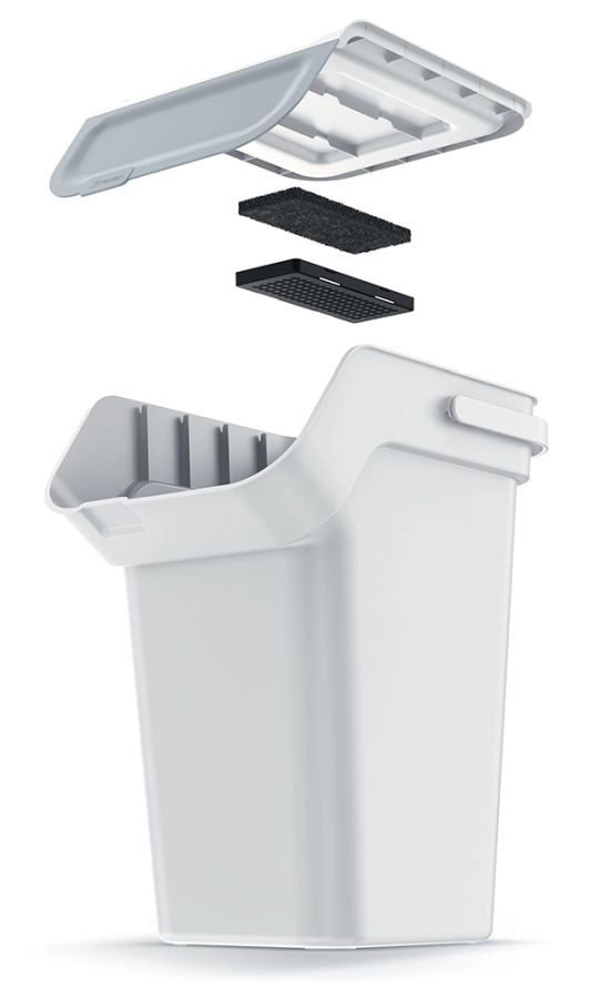 Ohranite red in svežino s pametnim košem z aktivnim oglenim filtrom, ki nevtralizira neprijetne vonjave neposredno pod pokrovom. Zahvaljujoč zložljivi zasnovi zlahka ustvarite kompakten sistem ločevanja odpadkov, ki prihrani prostor v kuhinji, pisarni ali tehničnem prostoru.