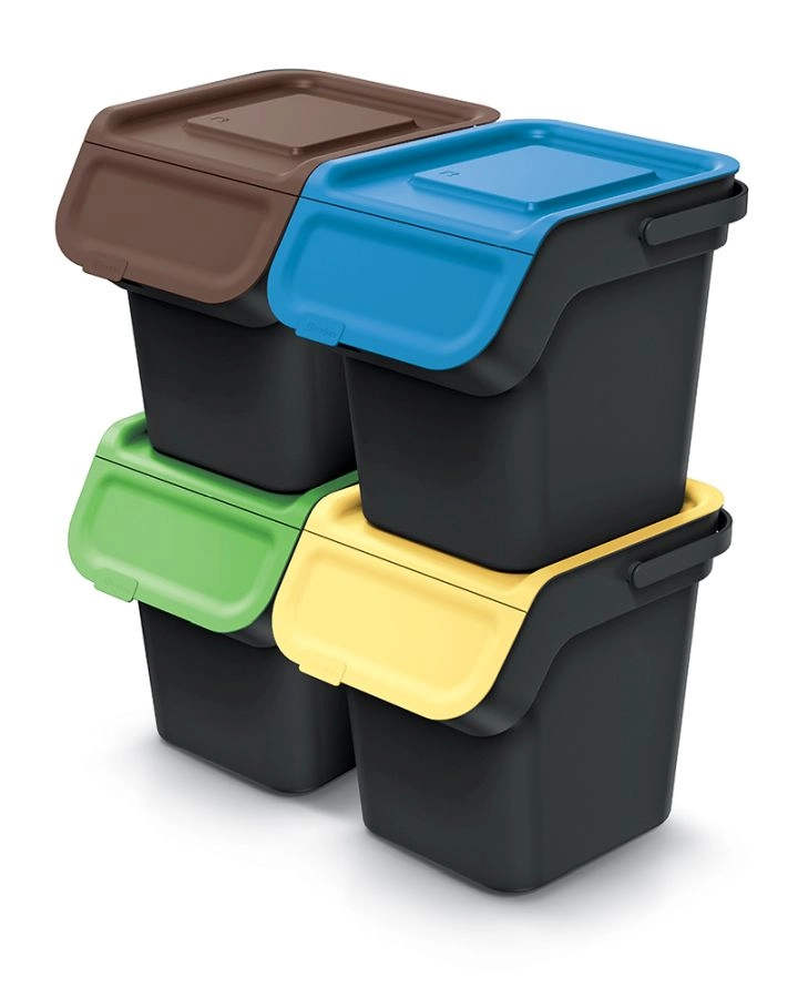 Štirje koši z barvno razlikovanimi pokrovi (rjava, modra, zelena, rumena) olajšajo hitro orientacijo pri ločevanju odpadkov.