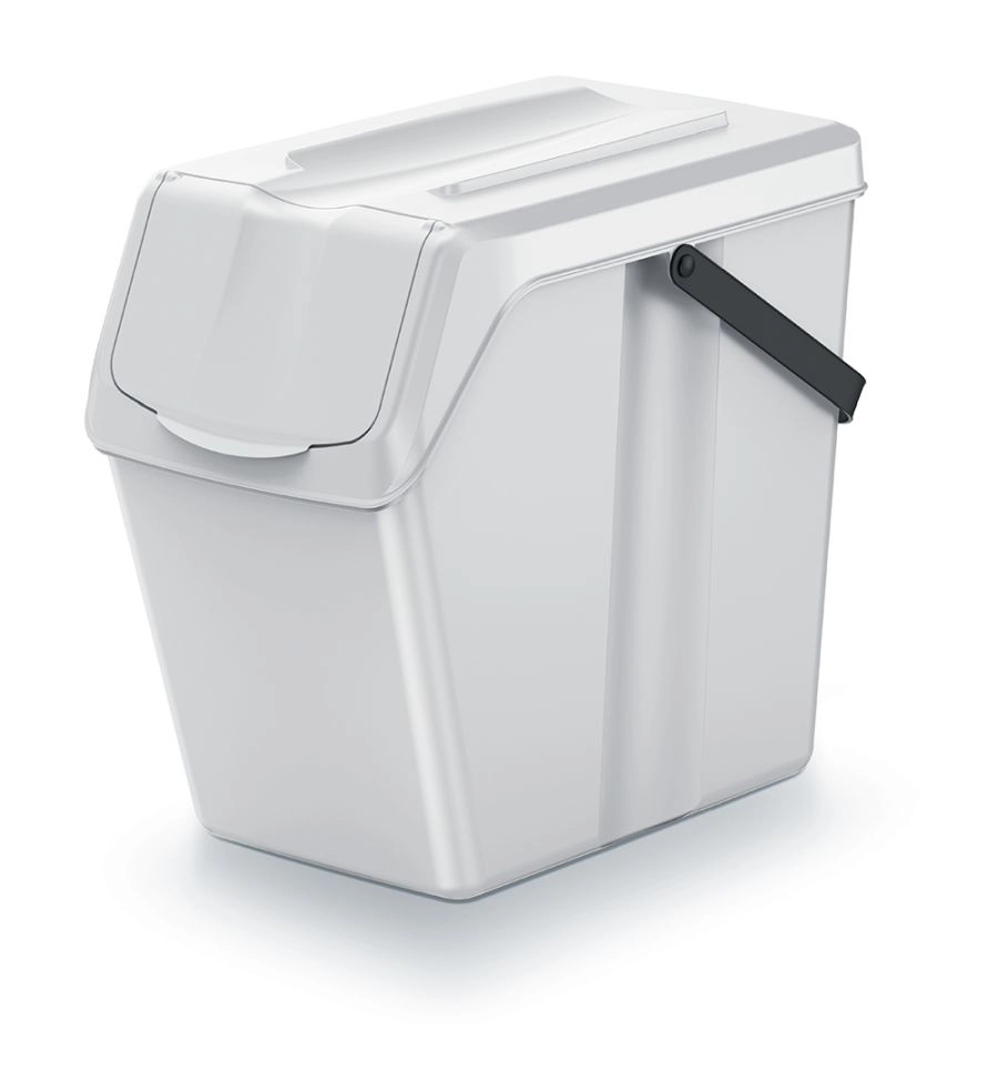 Odporen plastik zagotavlja dolgo življenjsko dobo in preprosto vzdrževanje – površino je dovolj obrisati z vlažno krpo. Nevsiljiva pepelnato siva barva se ujema z večino interierjev, priložene barvne nalepke pa pomagajo jasno označiti vrsto odpadkov in ohraniti preglednost sistema ločevanja.